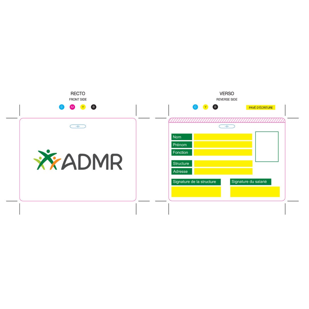 Plastifiée, elle comporte au recto le logo ADMR. Au verso, un pavé d’écriture permet d’inscrire nom, prénom, fonction, structure, adresse et signature de la personne.