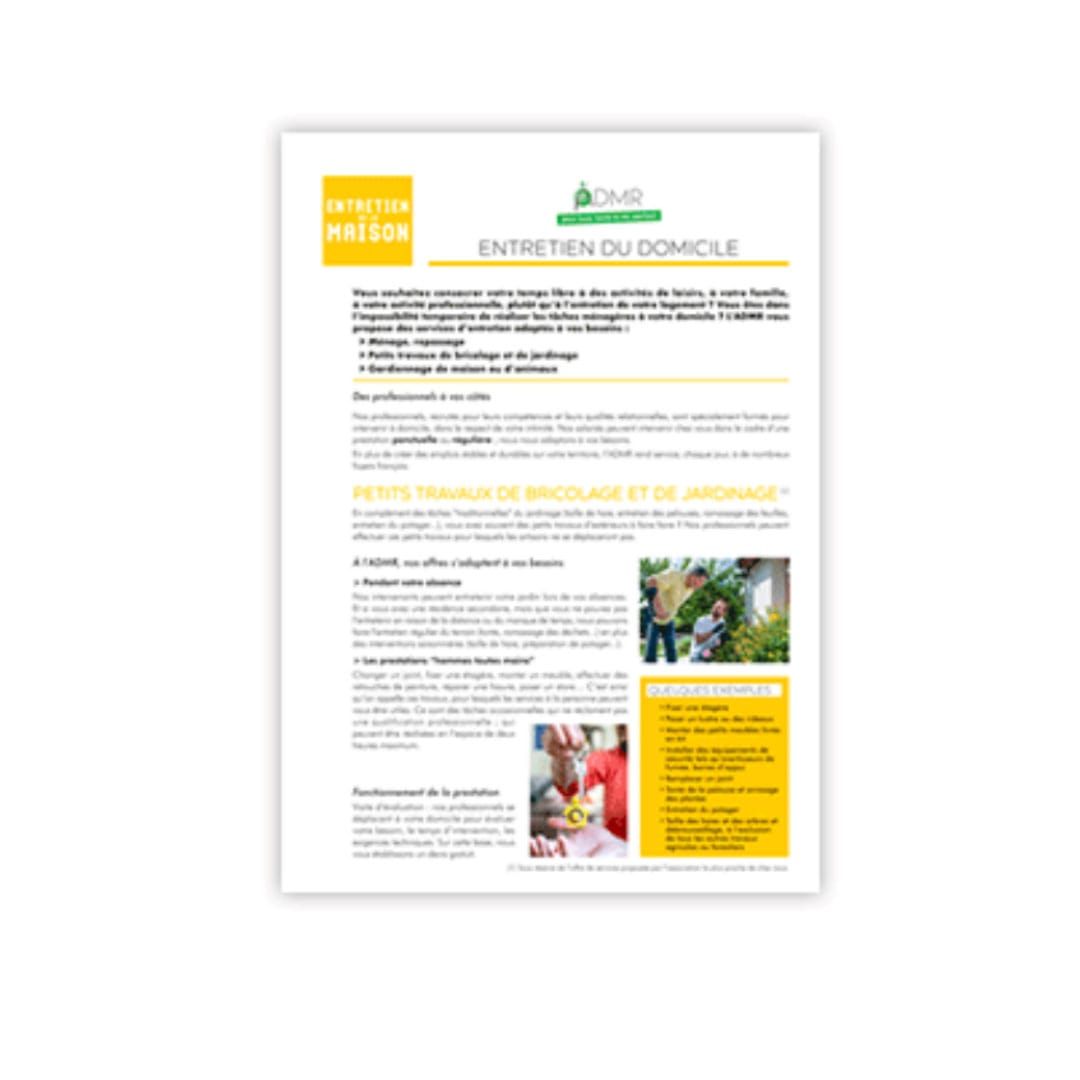 Ce fascicule «Entretien du domicile», format A4 et non personnalisable, vient renforcer notre offre de services. Il valorise l’accompagnement ADMR auprès des familles pour leur faciliter la vie au quotidien.Pour répondre aux besoins exprimés par nos fédérations, ce support a été formalisé sur des dimensions standards. Pratique et facilement imprimable, il est à glisser sous les rabats du Livret d’accueil Client «grand public».